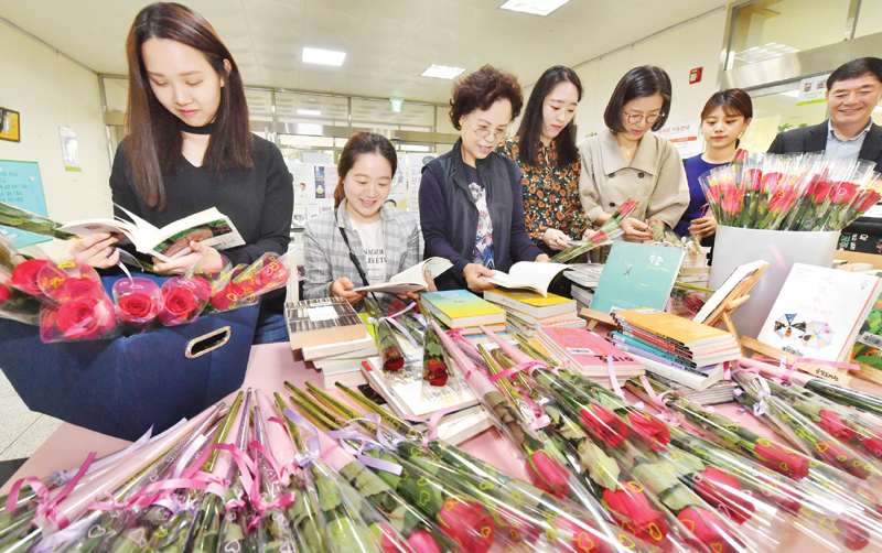 ¼¼°è Ã¥ÀÇ ³¯À» ¸Â¾Æ 23ÀÏ ¿ÀÀü ±¤ÁÖ ºÏ±¸ ¿î¾Ïµµ¼­°ü ·Îºñ¿¡¼­ Ã¥ ³ª´®Çà»ç°¡ ¿­¸° °¡¿îµ¥ Á÷¿øµéÀÌ Ã¥À» ´ë¿©ÇÏ·¯¿Â Áֹε鿡°Ô Àå¹Ì²ÉÀ» ³ª´²ÁÖ°í ÀÖ´Ù. À̳¯ Çà»ç´Â ¿î¾Ïµµ¼­°üÀÌ Áö¿ª¹ÎÀÇ µ¶¼­ÁõÁøÀ» À§ÇØ ¸¶·ÃÇß´Ù. /±è¿µ±Ù ±âÀÚ