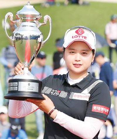 ÃÖÇýÁøÀÌ 12ÀÏ ¿¸° Çѱ¹¿©ÀÚÇÁ·Î°ñÇÁ(KLPGA)Åõ¾î NHÅõÀÚÁõ±Ç ·¹À̵𽺠èÇǾð½Ê¿¡¼ ¿ì½ÂÀ» Â÷ÁöÇÑ µÚ Æ®·ÎÇǸ¦ µé°í Æ÷Á ÃëÇϰí ÀÖ´Ù. /KLPGA Á¦°ø