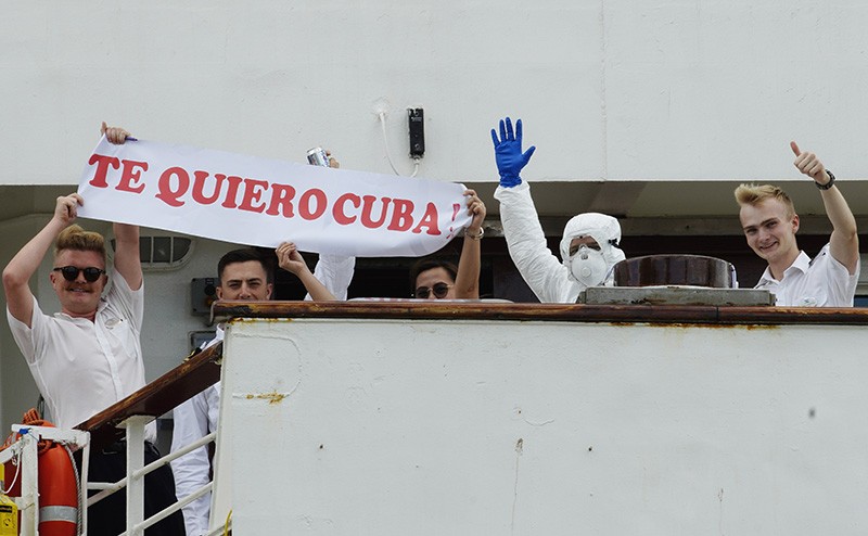 Äڷγª19 ȯÀÚ°¡ ¹ß»ýÇß´Ù´Â ÀÌÀ¯·Î Ä«¸®ºê ÇØÀÇ ¿©·¯ Ç×±¸¿¡¼­ ÅðÂ¥¸¦ ¸Â°í ¼öÁÖÀÏ µ¿¾È ÇØ»óÀ» ¶°µ¹´ø Å©·çÁî¼± ºê·¡¸¶È£ÀÇ ½Â¼±°´µéÀÌ 18ÀÏ(ÇöÁö½Ã°£) Äí¹Ù ¸¶¸®¿¤ Ç׿¡ ÀÔÇ×ÇÑ µÚ ½ºÆäÀξî·Î ¡®Äí¹Ù »ç¶ûÇØ¡¯¶ó°í ÀûÈù ÆÖ¸»À» µé°í ±â»µÇϰí ÀÖ´Ù. À̳¯ Äí¹Ù ´ç±¹Àº ½Â°´µéÀÌ Çϼ±ÇØ °í±¹À¸·Î µ¹¾Æ°¥ ¼ö ÀÖµµ·Ï µµ¿òÀ» Á¦°øÇß´Ù. /AP=¿¬ÇÕ´º½º
