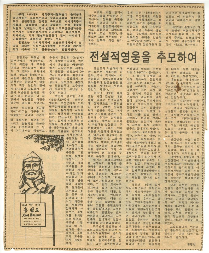 1984³â 11¿ù21ÀÏ °í·ÁÀνŹ® ¡®·¹´Ñ±âÄ¡¡¯°¡ È«¹üµµ Èä»ó °Ç¸³À» ±â³äÇØ ¡®Àü¼³Àû ¿µ¿õÀ» Ã߸ðÇÏ¿©¡¯¶ó´Â Á¦¸ñÀ¸·Î °ÔÀçÇÑ ±â»ç ³»¿ëÀÌ´Ù. È«¹üµµ À屺Àº ¿ì¸®³ª¶ó Ç×ÀϹ«ÀåÅõÀï ¿ª»ç»ó °¡Àå ºû³ª´Â ºÀ¿Àµ¿ÀüÅõ¸¦ ½Â¸®·Î À̲ö ÁöµµÀÚÀÌÀÚ ±èÁÂÁø°ú ÇÔ²² û»ê¸®´ëøÀ» ½Â¸®·Î À̲ö µ¶¸³¿îµ¿°¡´Ù. °í·ÁÀÎÀÌ °¡Àå Á¸°æÇÏ´Â À§ÀÎÀÌ´Ù.