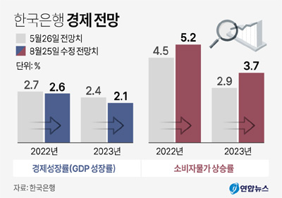ÇÑÀºÀº 25ÀÏ ¹ßÇ¥ÇÑ ¼öÁ¤ °æÁ¦Àü¸Á¿¡¼ ¿ÃÇØ ¼ÒºñÀÚ¹°°¡ »ó½Â·üÀ» 5.2%·Î Á¦½ÃÇß´Ù. ÀÌ´Â Áö³ 5¿ù ¹ßÇ¥ÇÑ ±âÁ¸ Àü¸ÁÄ¡(4.5%)º¸´Ù 0.7%Æ÷ÀÎÆ®(p)³ª ³ô°í, ÇÑÀº ¼ÒºñÀÚ¹°°¡ ¿¬°£ Àü¸ÁÄ¡·Î¼ 1998³â(9.0%) ÀÌÈÄ 24³â¸¸¿¡ °¡Àå ³ôÀº ¼öÁØÀÌ´Ù.