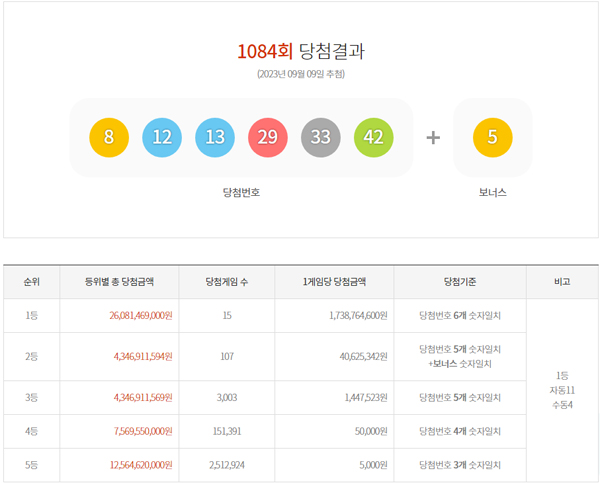 Donghaeng Lottery Co., Ltd., a lottery consignment service provider, announced on the 9th that as a result of the 1084th Lotto drawing, the first prize winning numbers were '29, 42, 33, 8, 12, 13' and the second prize bonus number was '5'.