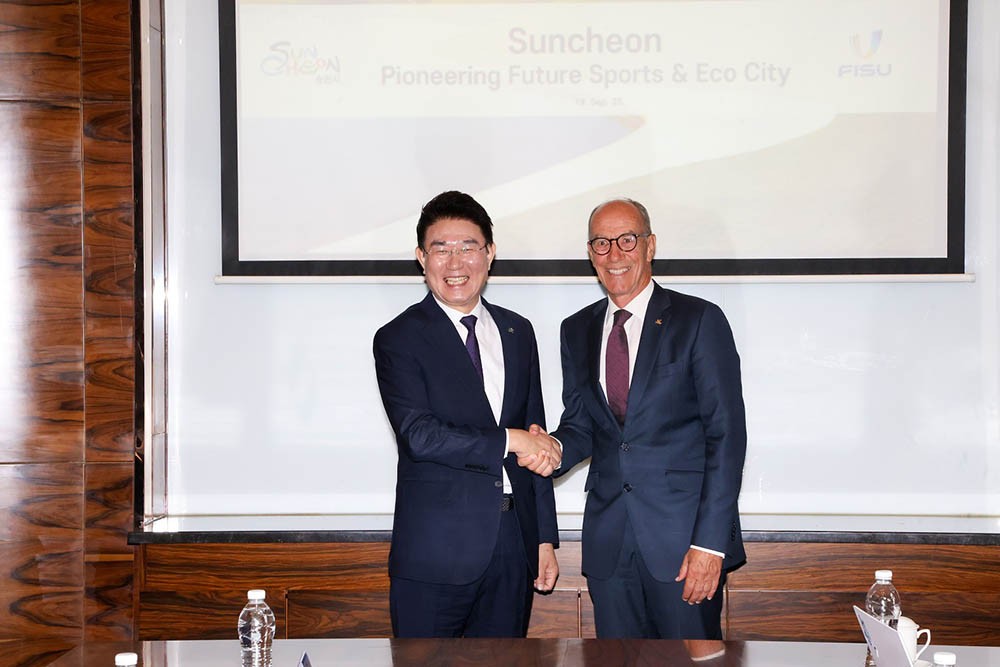³ë°ü±Ô(¿ÞÂÊ) ¼øÃµ½ÃÀåÀÌ Áö³ 19ÀÏ Áß±¹ ´Ù·Ë¿¡¼ ·¹¿ÂÁî ¿¡´õ ±¹Á¦´ëÇнºÆ÷Ã÷¿¬¸Í(FISU) ȸÀåÀ» ¸¸³ª ¼øÃµ½ÃÀÇ 2035³â ¼¼°èÀ¯´Ï¹ö½Ã¾Æµå´ëȸ °³ÃÖ ÀÇÇâÀ» ¼³¸íÇÑ ÈÄ ±â³äÃÔ¿µÀ» Çϰí ÀÖ´Ù. <¼øÃµ½Ã Á¦°ø>