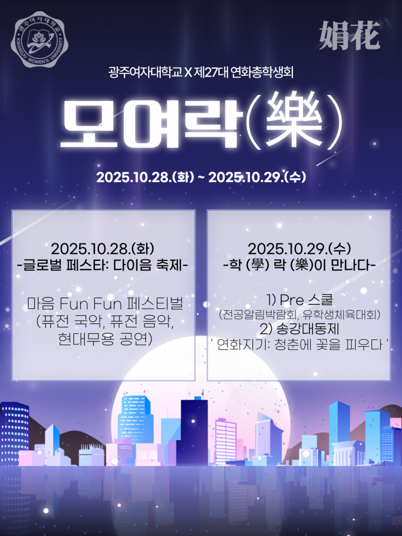 ±¤ÁÖ¿©ÀÚ´ëÇб³´Â 23ÀÏ ¡°¿À´Â 28-29ÀÏ ÀÌÆ²°£ ±³³» Àü¿ª¿¡¼ ¡®Ã»ÃᡤÁö¿ª¡¤¼¼°è°¡ ¸¸³ª´Â °¡À» ÃàÁ¦(Á¦27ȸ ¼Û°ÃàÁ¦)¡¯¸¦ °³ÃÖÇÑ´Ù¡±°í ¹àÇû´Ù.