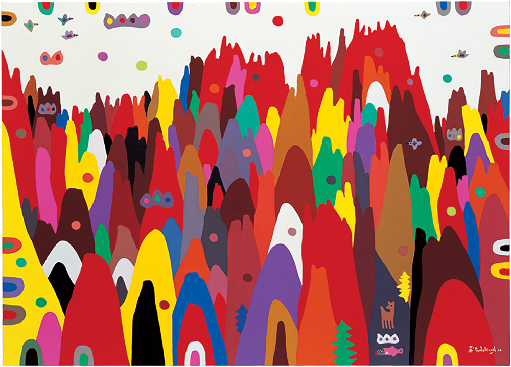 ÀÌÈÄ ¿À ȹéÀÇ ÀÛ¾÷Àº º»°ÝÀûÀ¸·Î dz¼ö ±×¸®°í ¿À¹æ»öÀÇ ¼¼°è·Î µé¾î¼±´Ù. ¹°°í±â¿Í ¾ß»ýÈ, ¹Ýº¹µÇ´Â ¶ì ÇüÅÂÀÇ µµ»óµéÀÌ È¸é °÷°÷¿¡ µîÀåÇÑ´Ù. Àü±¹ÀÇ »êõÀ» ´ä»çÇϸç ãÀº dz°æÀº ´õ ÀÌ»ó ÀçÇöÀÇ ´ë»óÀÌ ¾Æ´Ï¶ó, »ö°ú µµ»óÀ¸·Î À籸¼ºµÈ »ó¡Àû ȸéÀ¸·Î ³ªÅ¸³´Ù.