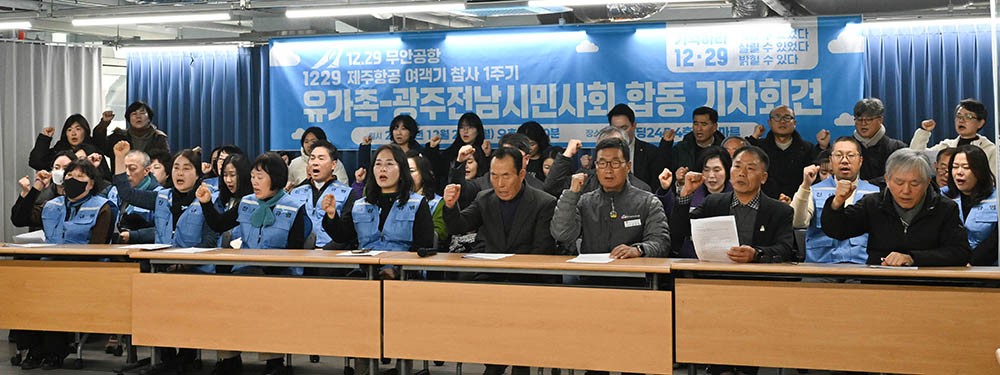 22ÀÏ ÀüÀϺôµù245 ½Ã¹Î¸¶·ç¿¡¼ 12¡¤29 Á¦ÁÖÇ×°ø Âü»ç 1ÁÖ±â À¯°¡Á·ÇùÀÇȸ¡¤±¤ÁÖÀü³²½Ã¹Î»çȸ ÇÕµ¿ ±âÀÚȸ°ßÀÌ ¿·Á Âü¼®ÀÚµéÀÌ ±¸È£¸¦ ¿ÜÄ¡°í ÀÖ´Ù./±è¾Ö¸® ±âÀÚ¡¤Á¶¿µ±Ç ÀÎÅϱâÀÚ