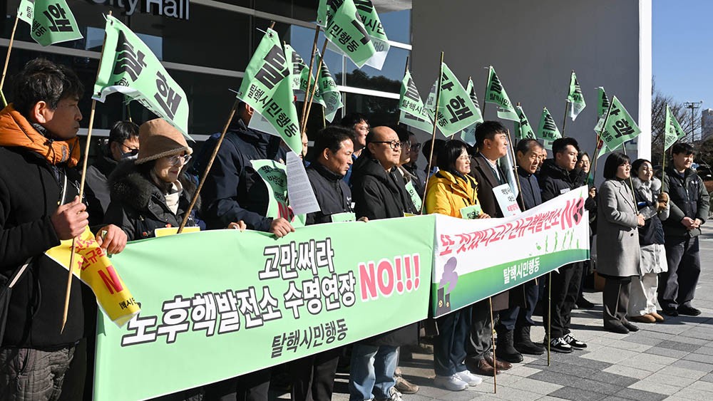 ¿µ±¤ ÇѺûÇÙ¹ßÀü¼ÒÀÇ Å»ÇÙÈñ¸ÁÀü±¹¼ø·Ê ±âÀÚȸ°ßÀÌ 8ÀÏ ¿ÀÀü ±¤ÁÖ½Ãû ¾Õ¿¡¼­ ¿­·Á Å»ÇٽùÎÇൿ ½Ã¹Î´Üü°¡ ³ëÈÄ ÇÙ¹ßÀü¼Ò ¼ö¸í ¿¬Àå Áß´Ü ¹× ½Å±Ô ÇÙ¹ßÀü¼Ò °Ç¼³À» ¹Ý´ëÇÏ´Â ±¸È£¸¦ ¿ÜÄ¡°í ÀÖ´Ù./Á¶¿µ±Ç ±âÀÚ