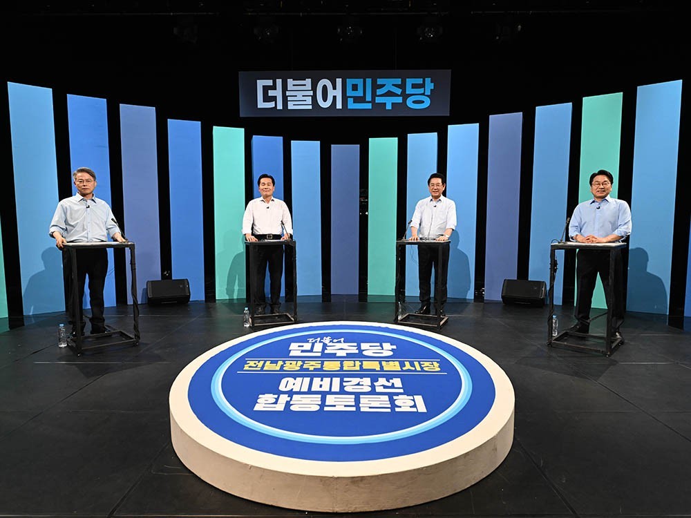 Áö³­ 17ÀÏ ¿ÀÈÄ ±¤ÁÖ ³²±¸ ±¤ÁÖMBC ½ºÆ©µð¿À¿¡¼­ ¿­¸° ´õºÒ¾î¹ÎÁÖ´ç Àü³²±¤ÁÖÅëÇÕÆ¯º°½ÃÀå °æ¼± AÁ¶ Èĺ¸ 4¸íÀÌ ¿­¶í Åä·ÐÀ» ¹úÀ̰í ÀÖ´Ù. »çÁø ¿ÞÂʺÎÅÍ ±âÈ£ 6¹ø ¹ÎÇü¹è ±¹È¸ÀÇ¿ø, ±âÈ£ 4¹ø ÁÖöÇö ±¹È¸ÀÇ¿ø, ±âÈ£ 1¹ø ±è¿µ·Ï ¿¹ºñÈĺ¸(Àü³²Áö»ç Á÷¹«Á¤Áö), ±âÈ£ 2¹ø °­±âÁ¤ ±¤ÁÖ½ÃÀå./Á¶¿µ±Ç ±âÀÚ