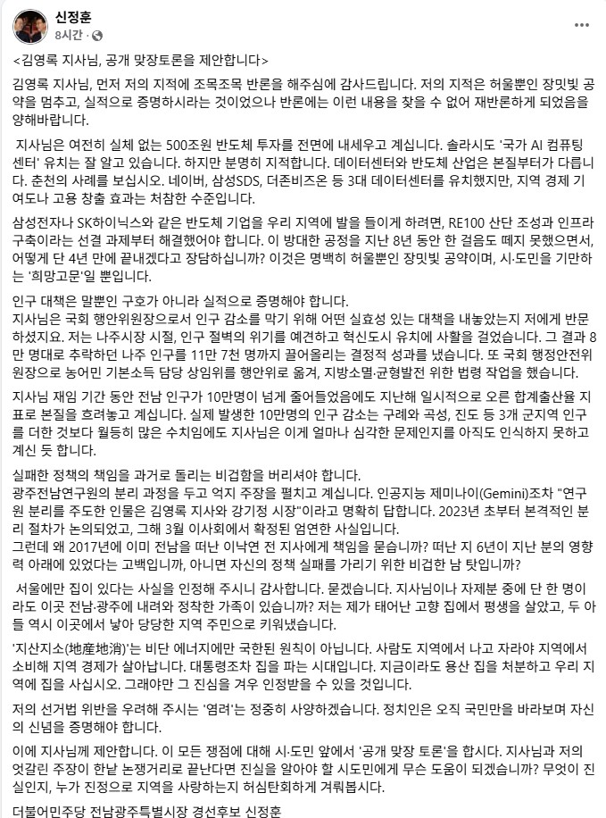 ´õºÒ¾î¹ÎÁÖ´ç Àü³²±¤ÁÖÅëÇÕÆ¯º°½ÃÀå °æ¼± Èĺ¸ÀÎ ½ÅÁ¤ÈÆ ±¹È¸ÀÇ¿øÀÌ °æÀïÀÚÀÎ ±è¿µ·Ï(Àü³²Áö»ç Á÷¹«Á¤Áö) ¿¹ºñÈĺ¸¿¡ ´ëÇØ ¿¬ÀÏ Àü³²µµÁ¤°ú °ø¾àÀÇ ºñÇö½Ç¼ºÀ» ºñÆÇÇÏ¸ç °ø°ÝÇϰí ÀÖ´Ù.