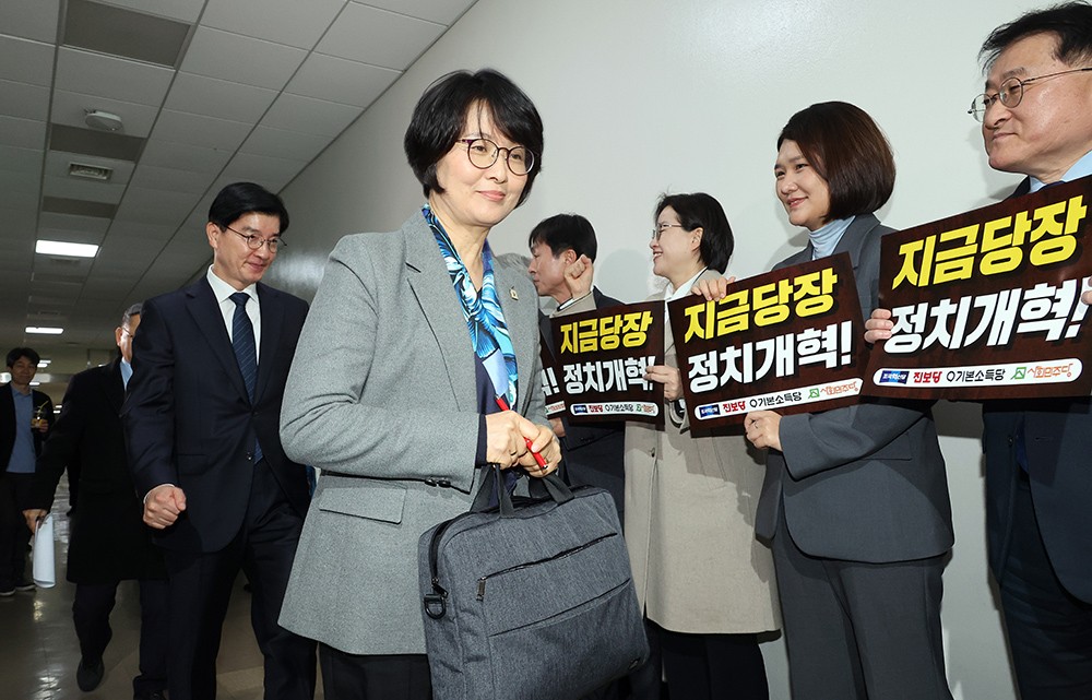 ±¹È¸ Á¤Ä¡°³ÇõƯº°À§¿øÈ¸ ¼Ò¼Ó ¹ÎÁÖ´ç ÀÓ¹Ì¾Ö ÀÇ¿øÀ» ºñ·ÔÇÑ ÀÇ¿øµéÀÌ 19ÀÏ ±¹È¸ Á¤°³Æ¯À§ ȸÀÇ½Ç ¾Õ¿¡¼ Á¤Ä¡ °³ÇõÀ» Ã˱¸Çϸç ÇÇÄÉÆÃÀ» ÇÏ´Â Áøº¸ 4´ç ÀÇ¿øµé ¾ÕÀ» Áö³ª ȸÀÇÀå¿¡ ÀÔÀåÇϰí ÀÖ´Ù./¿¬ÇÕ´º½º