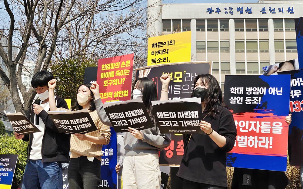 26ÀÏ ¼øÃµ½Ã ¿ÕÁöµ¿ ±¤ÁÖÁö¹æ¹ý¿ø ¼øÃµÁö¿ø ¾Õ¿¡¼ ¡®¾Æµ¿ÇÐ´ë ¾öÁß Ã³¹úÀ» Ã˱¸ÇÏ´Â ±¹¹ÎµéÀÇ ¸ðÀÓ ÇØµç¾Æ »ç¶ûÇØ, ±×¸®°í ±â¾ïÇØ¡¯ °ü°èÀÚµéÀÌ »ýÈÄ 4°³¿ù ¾ÆµéÀ» ÇдëÇØ ¼ûÁö°Ô ÇÑ ÇøÀǸ¦ ¹Þ´Â Ä£¸ð¿Í À̸¦ ¹æÄ¡ÇÑ Ä£ºÎ¿¡ ´ëÇÑ ¾ö¹úÀ» Ã˱¸ÇÏ´Â Áýȸ¸¦ Çϰí ÀÖ´Ù./¾ÈÀ翵 ±âÀÚ