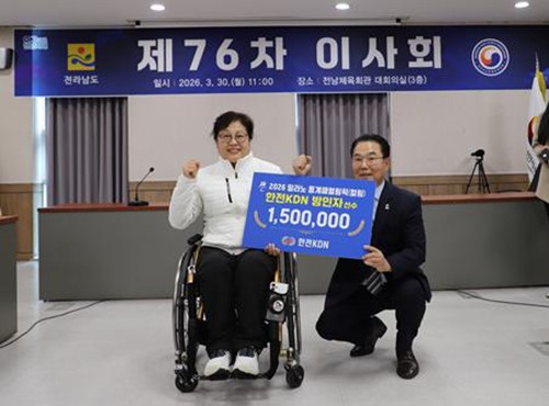 Àü³²Àå¾ÖÀÎüÀ°È¸´Â Áö³´Þ 30ÀÏ ¿¸° Á¦76Â÷ ÀÌ»çȸ¿¡¼ 2026 ¹Ð¶ó³ë-ÄÚ¸£Æ¼³ª µ¿°èÆÐ·²¸²ÇÈ¿¡¼ Àü³²À» ºû³½ ÈÙü¾îÄøµ ¹æ¹ÎÀÚ(È¥¼º 4ÀÎÁ¶ ¼¼°è·©Å· 5À§)¸¦ °Ý·ÁÇÏ°í ¼Ò¼ÓÆÀ ÇÑÀü KDNÀÇ ÁöÁ¤±âʱÝÀ» Àü´ÞÇß´Ù. (»çÁø)