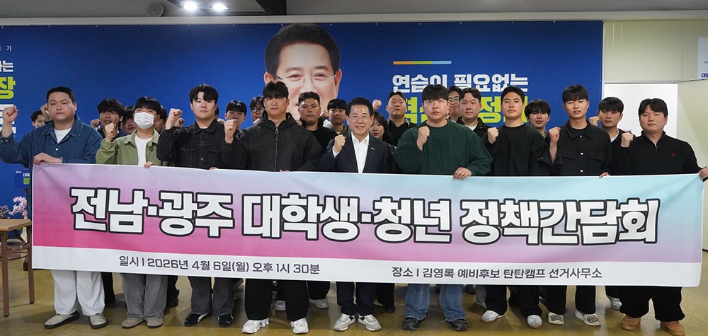 ´õºÒ¾î¹ÎÁÖ´ç ±è¿µ·Ï Àü³²±¤ÁÖÅëÇÕÆ¯º°½ÃÀå ¿¹ºñÈĺ¸(Àü³²Áö»ç Á÷¹«Á¤Áö)°¡ Áö³ 6ÀÏ ±¤ÁÖ ¼±¸ ¼±°Å»ç¹«¼Ò¿¡¼ ±¤ÁÖ¡¤Àü³² û³â±â¾÷ÀÎ 30¿©¸í°ú Á¤Ã¥°£´ãȸ¸¦ °¡Áø µÚ ±â³äÃÔ¿µÀ» Çϰí ÀÖ´Ù.<±è¿µ·Ï ¿¹ºñÈĺ¸ Ãø Á¦°ø>