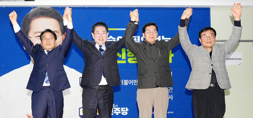 ´õºÒ¾î¹ÎÁÖ´ç Àü³²±¤ÁÖÅëÇÕÆ¯º°½ÃÀå °æ¼± Èĺ¸¿´´ø ½ÅÁ¤ÈÆ ±¹È¸ÀÇ¿ø(³ªÁÖ¡¤È¼ø)ÀÌ 9ÀÏ ±¤ÁÖ ¼±¸ ±¤Ãµµ¿ ±è¿µ·Ï ¿¹ºñÈĺ¸ ¼±°Å»ç¹«¼Ò¿¡¼ ±è Èĺ¸ ÁöÁö¸¦ ¼±¾ðÇÑ µÚ °±âÁ¤ Àü Èĺ¸, À̺´ÈÆ »óÀÓ¼±´ëÀ§¿øÀå µî°ú ÇÔ²² ½Â¸®¸¦ ´ÙÁüÇÏ¸ç ¼ÕÀ» µé¾îº¸À̰í ÀÖ´Ù./Á¶¿µ±Ç ±âÀÚ