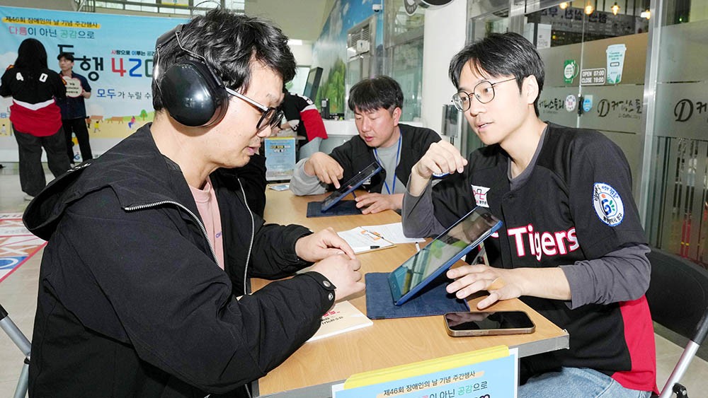 Á¦46ȸ Àå¾ÖÀÎÀÇ ³¯ ±â³ä ÁÖ°£Çà»ç°¡ ¿­¸° 15ÀÏ ¿ÀÈÄ ±¤ÁÖ µ¿±¸Ã» 1Ãþ ·Îºñ¿¡¼­ ½Ã¹ÎµéÀÌ ÀÔ ¸ð¾çÀ» º¸°í ´Ü¾î¸¦ ¸ÂÃߴ û°¢ Àå¾ÖÀÎ °£Á¢ üÇèÀ» Çϰí ÀÖ´Ù. Àå¾ÖÀÎÀÇ ³¯(4¿ù20ÀÏ)Àº Àå¾ÖÀο¡ ´ëÇÑ ÀÌÇØ¿Í Àå¾ÖÀÎÀÇ ÀçȰ ÀÇ¿åÀ» °íÃëÇϱâ À§ÇÑ ¸ñÀûÀ¸·Î Á¦Á¤µÈ ¹ýÁ¤±â³äÀÏÀÌ´Ù./Á¶¿µ±Ç ±âÀÚ