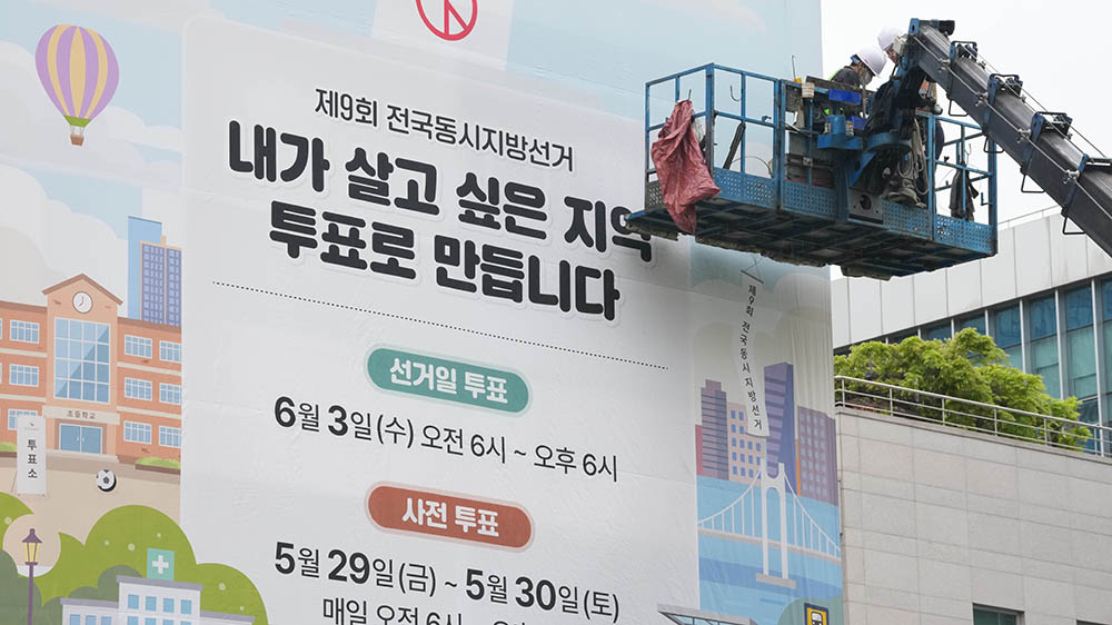 6¡¤3 Áö¹æ¼±°Å°¡ 42ÀÏ ¾ÕÀ¸·Î ´Ù°¡¿Â 22ÀÏ ¿ÀÀü ±¤Áֽü±°Å°ü¸®À§¿øÈ¸¿¡¼­ ½Ã¹ÎµéÀÇ ÅõÇ¥¸¦ µ¶·ÁÇÏ´Â ¸Þ½ÃÁö°¡ ´ã±ä È«º¸ Ç÷¡Ä«µå¸¦ ¿Üº®¿¡ °É°í ÀÖ´Ù. ÇÑÆí À̹ø Àü±¹µ¿½ÃÁö¹æ¼±°Å »çÀüÅõÇ¥´Â 5¿ù29-30ÀÏ ÀÌÆ²°£ ½Ç½ÃµÈ´Ù. /Á¶¿µ±Ç ±âÀÚ